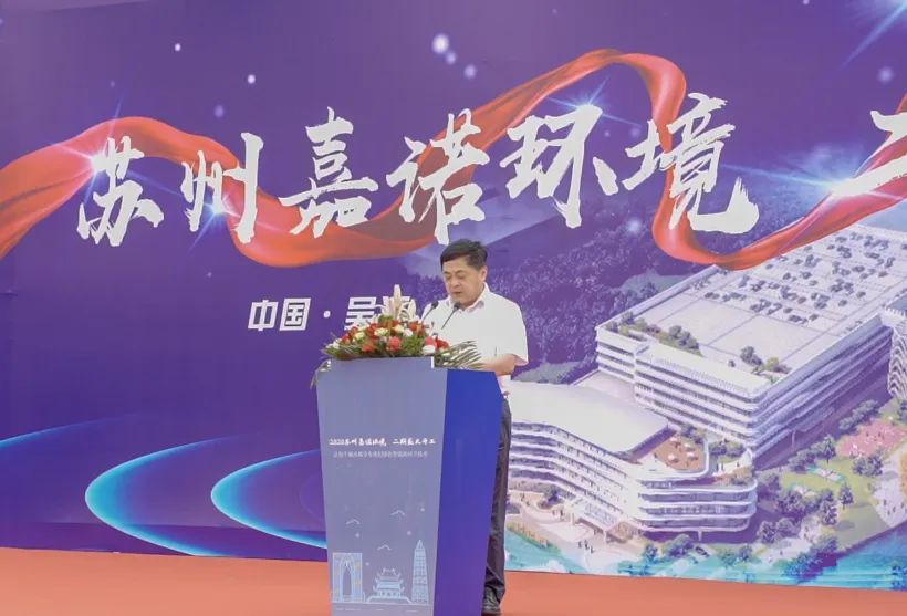 蘇州嘉諾環境工程有限公司董事長袁靖在致辭中謹代表公司向蒞臨開工奠基儀式的吳江區領導王書記、戚副區長、開發區范書記及在座的各位領導、各位貴賓表示熱烈的歡迎和衷心的感謝!